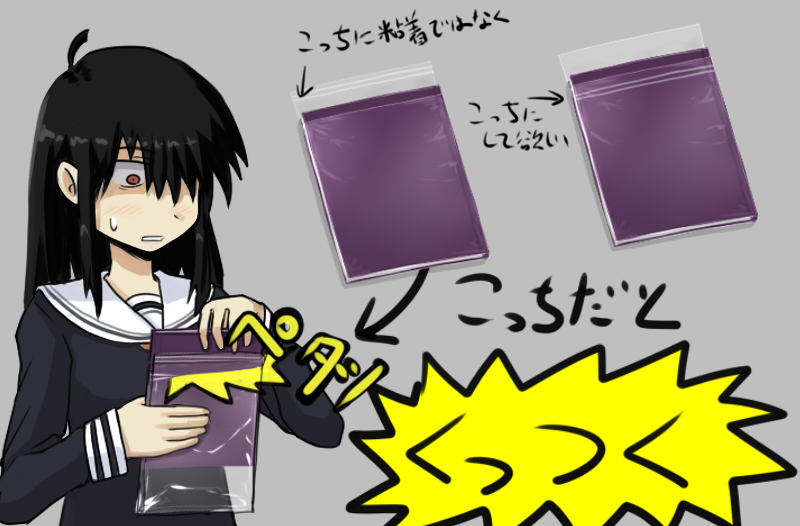 (´・ω・)ですよねー。なるほど、反対側に折り返してくっつかないようにしてるんですね。僕はもう最近リスク回避の方を優先するようにしたんで、粘着面を開けた後は袋の端から裂いて開けてしまうことにしちゃってますねー。