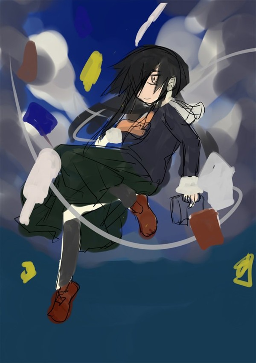 まずは大まかなラフ、この時点ではねね子の制服デザインも決まっていなかったが、とりあえずusiさんのイラストみたいに小物が降ってる的な構図にしようと決める。