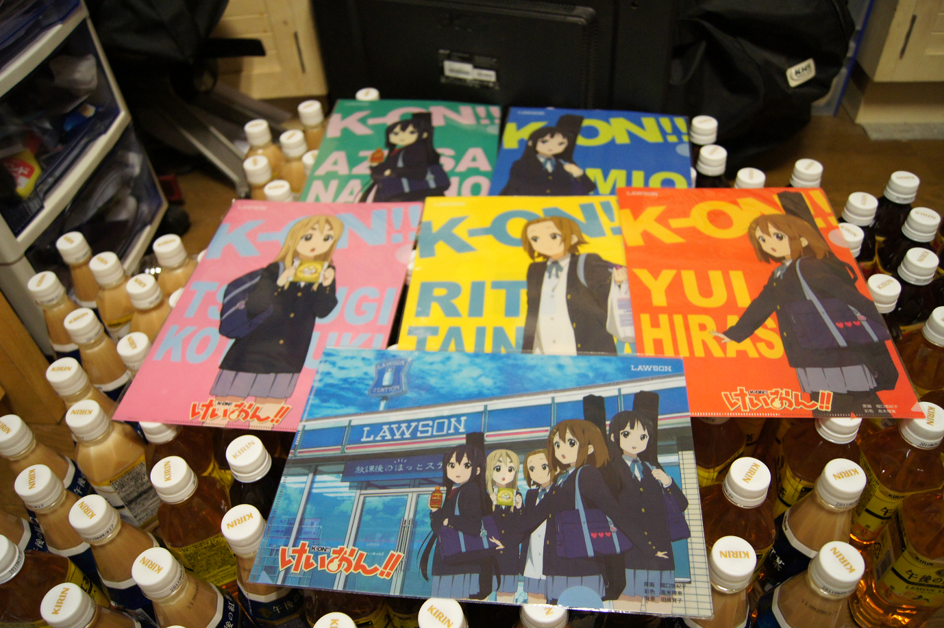 :(;゙゚’ω゚’):おわかりいただけただろうか……。けいおん!!クリアファイルの後ろにずらりとならんだ午後の紅茶の亡霊達。彼らはまるで我々を招くかのように列をなしているのだ……。