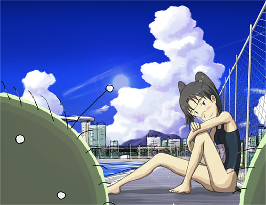 遠景もせっかく描いたのにほとんど隠れてしまって意味がなくなってるし、そもそも背景が大黒市に見えないし…。背景の感じだと校舎の屋上の上にプールがあるような感じになっちゃってますね…。